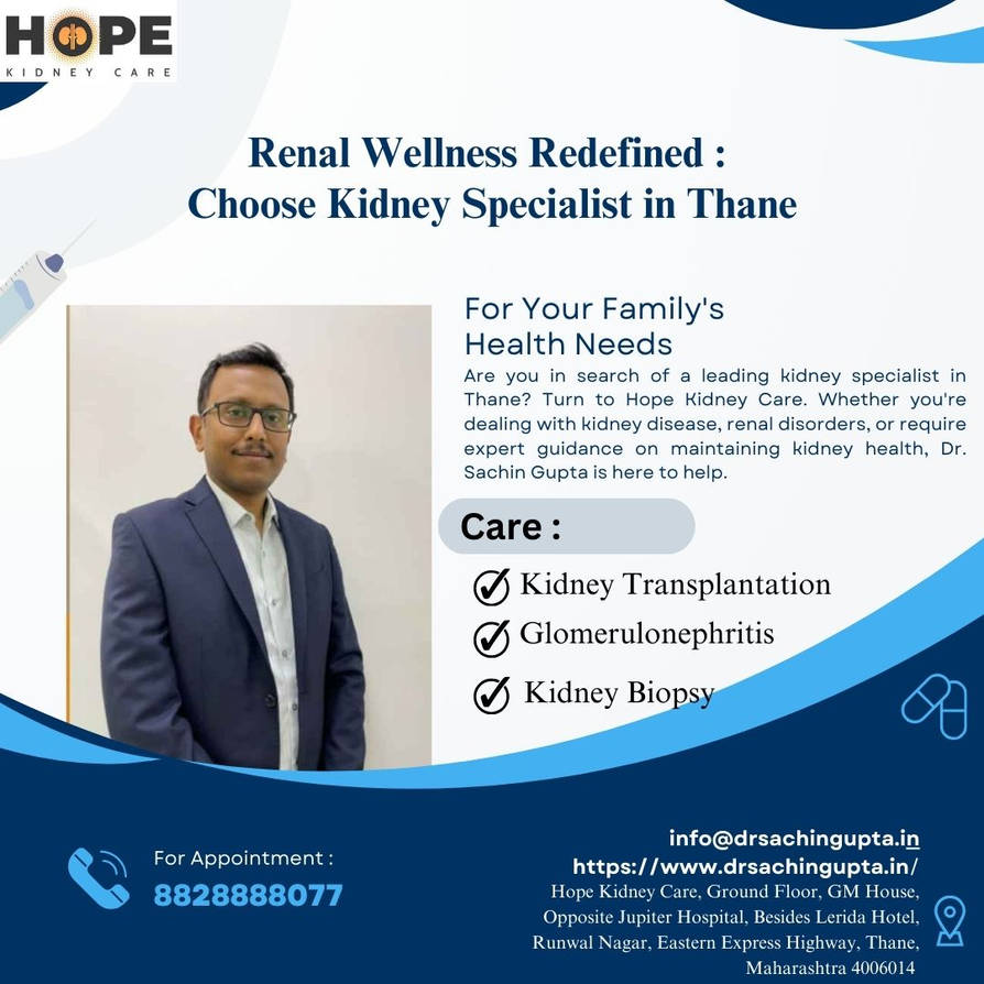 Dr. Sachin Gupta is a nephrologist with expertise in the area of, kidney diseases, renal transplants (including, blood group incompatible transplants), dialysis (hemodialysis and peritoneal dialysis) hypertension and critical care nephrology. He is an active member of the International Society of Nephrology and Indian Society of Nephrology. Dr Sachin Gupta consults at HOPE KIDNEY CARE, THANE and is associated with multiple hospitals in Thane. He was also associated with Jaslok hospital, Hinduja hospital and Wockhardt hospital in the past.'